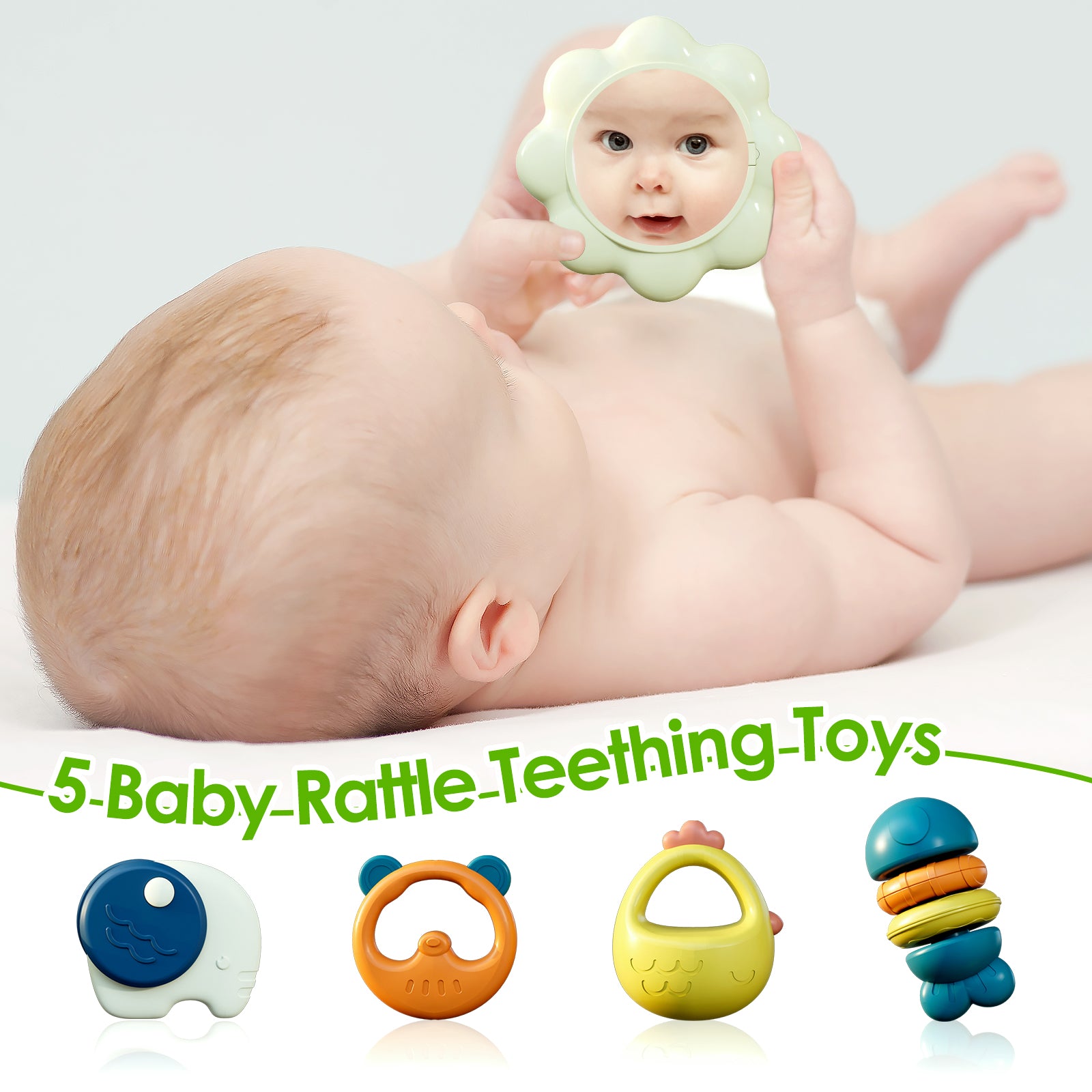- 【5 In 1 All-Round Development】4 Removable sensory toys and 1 flower mirror, fully meet the baby's growth needs. 4 Toys: Baby teapot rattle, water cup rattles for newborn baby touching-growing,and TV rattle,clock rattle for improve baby responsiveness.Piano keyboards touching for graphics ,listening .All for colors cognitive. 1 flower mirror,as an important way for self-discovery.