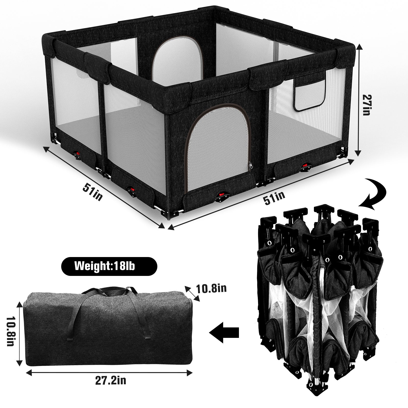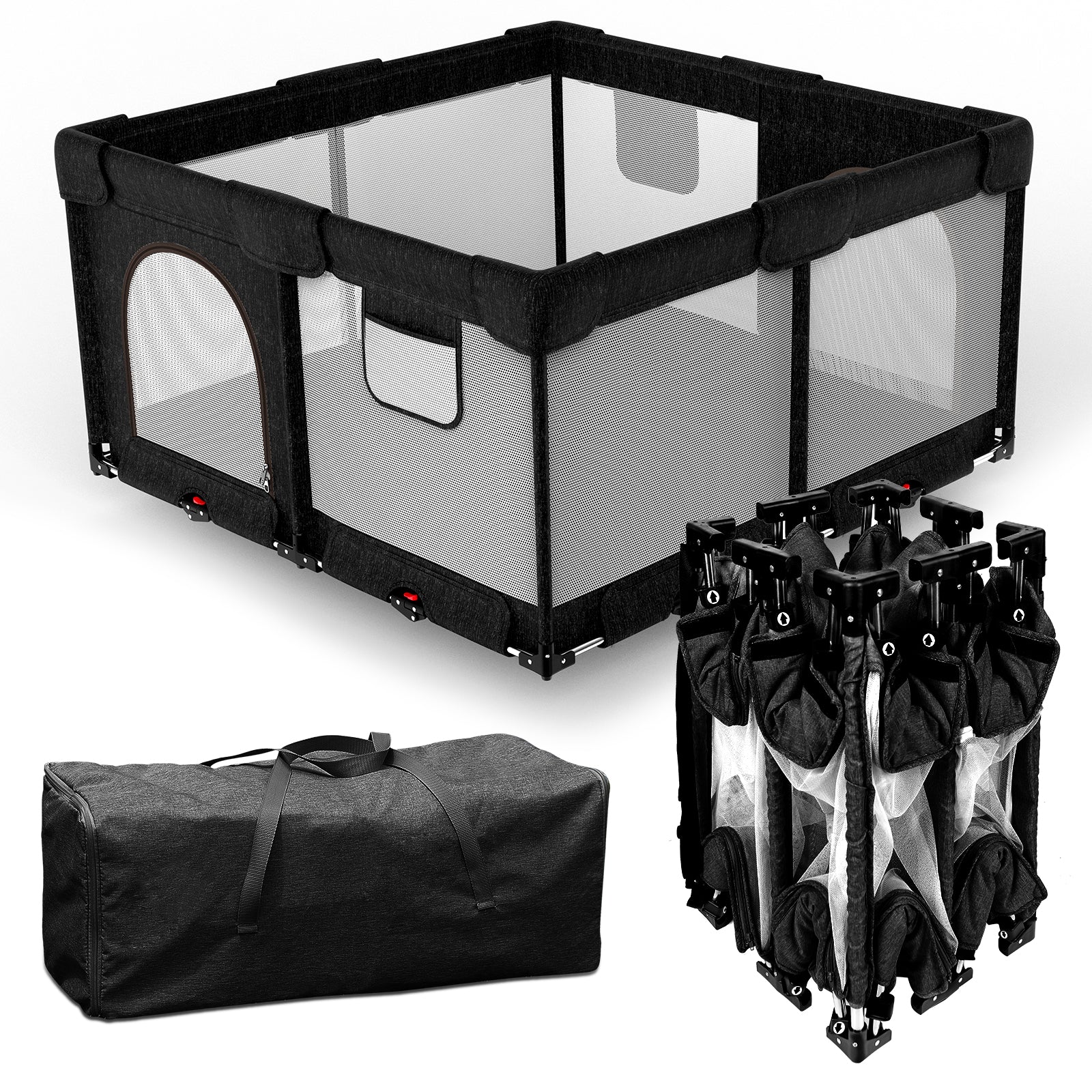 Dearlomum Foldable Baby Playpen with Gate, Extra Large Collapsible Play Yard for Babies & Toddlers, Portable Travel Playpen, Baby Activity Center for Indoor & Outdoor Use (Black )