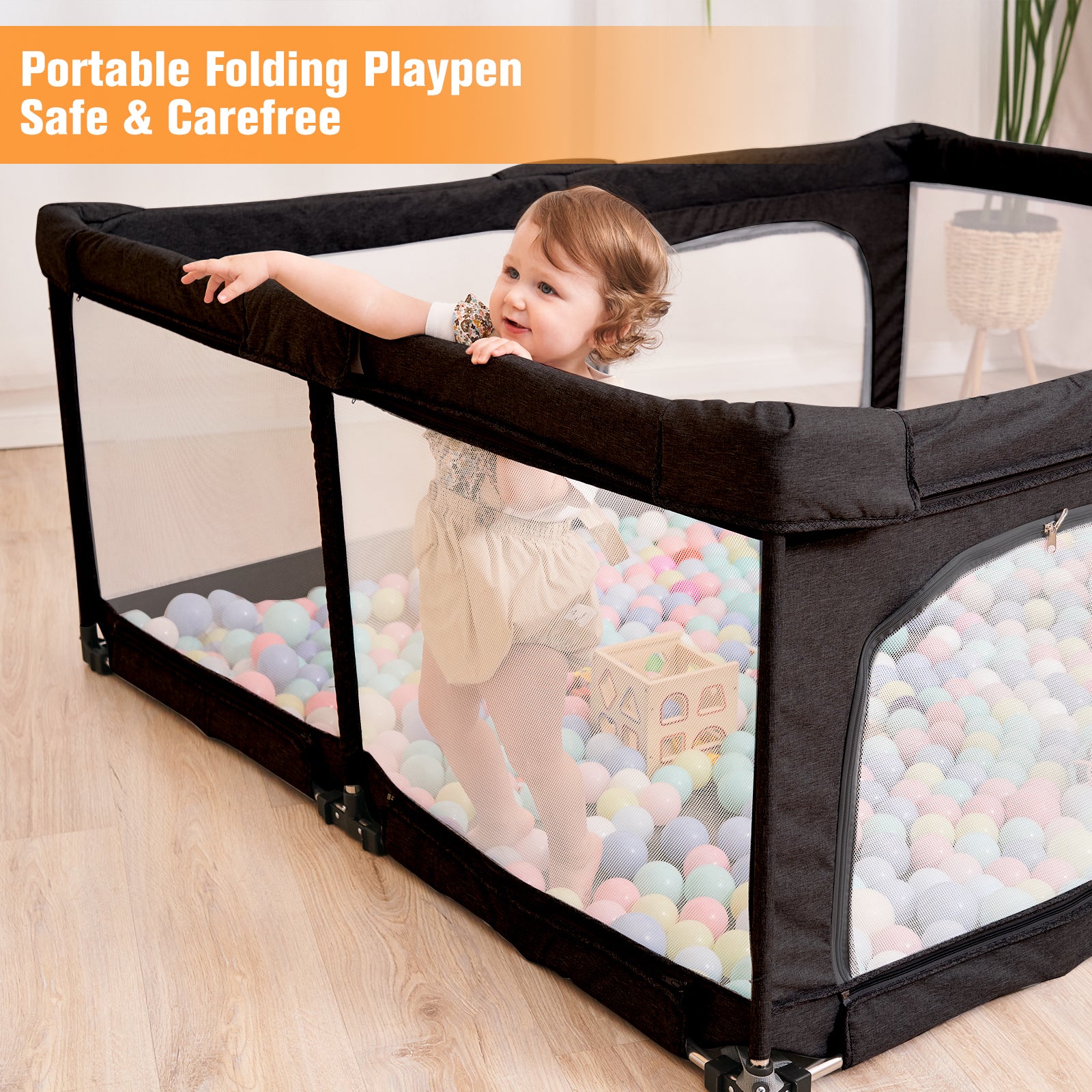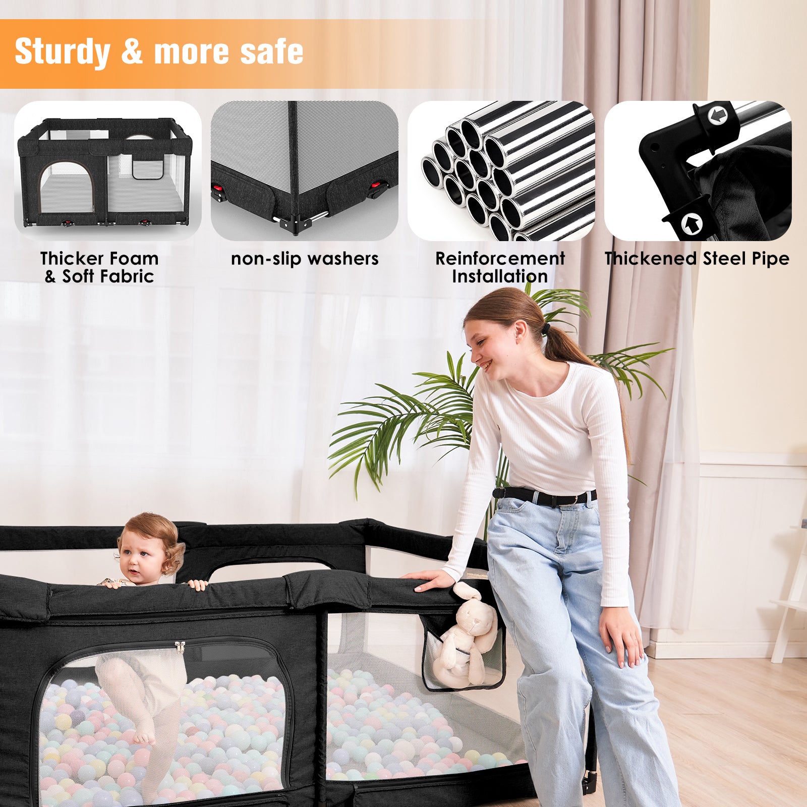 - Extra Safe, Extra Fun:Our playpen is designed for safety. It's made with strong fabric and mesh, and we've added non-slip features for extra stability. Plus, there's soft padding around the edges to keep your little one extra safe during playtime.